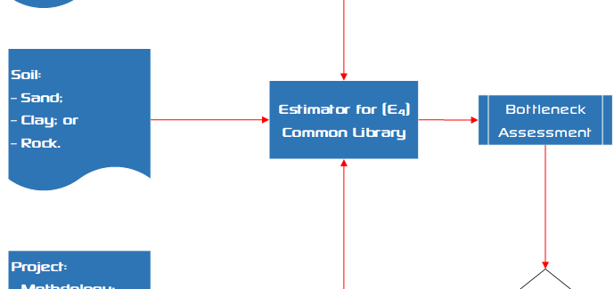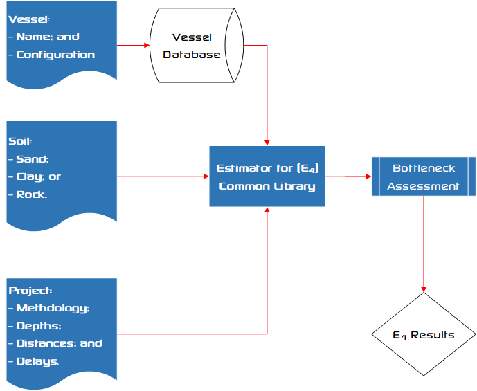 Figure below shows the dredging estimating tool general work flow of E4. By specifying the vessel name and configuration the database generates the many vessel particulars required for the E4 library. Next the soil properties for either sand, clay or rock are specified. The project details are provided last allowing E4 to calculate the productivity for each physical process. Automatically, the bottleneck is identified to determine the productivity. This assessment generates insight on productivity risks, but also on opportunities for optimisation.